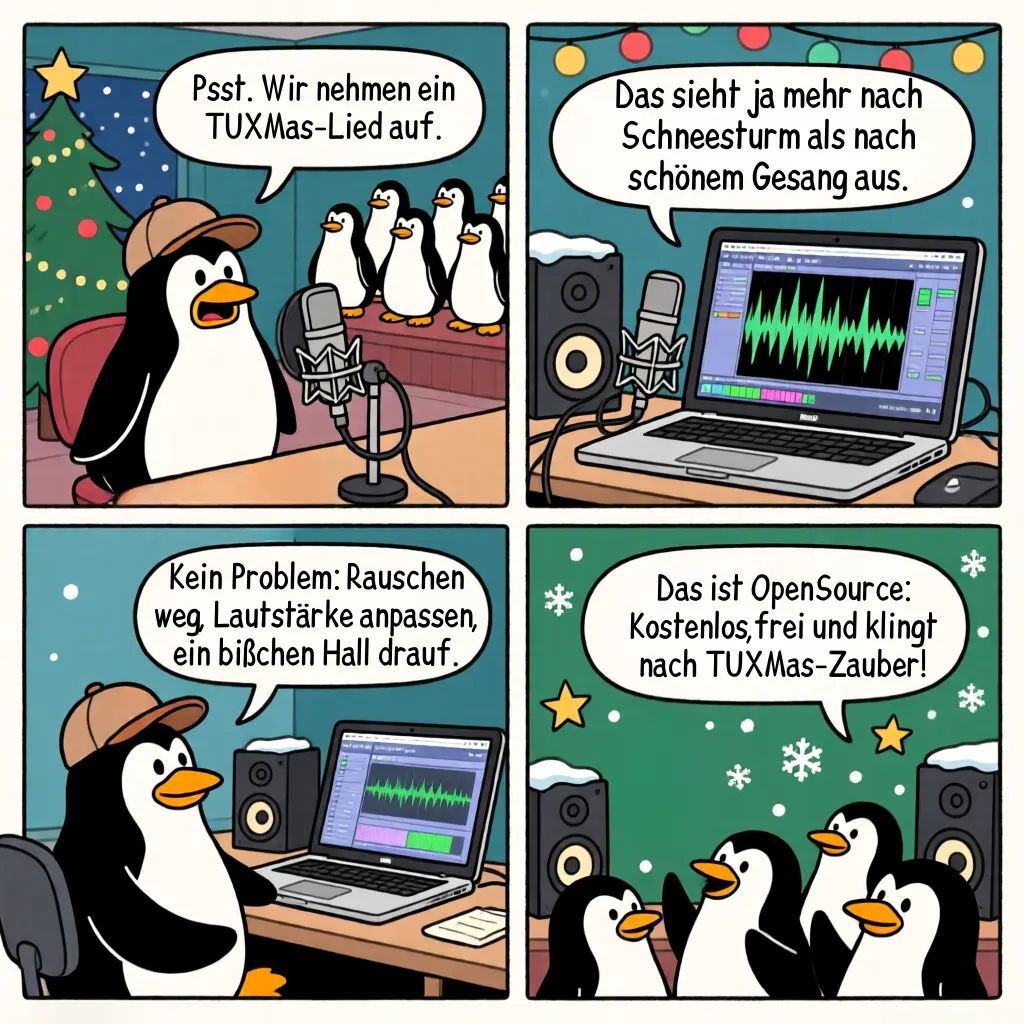 Audacity (www.audacityteam.org/) ist ein kostenloses OpenSource-Programm für Linux, Windows und Mac, mit dem Ihr ganz einfach Tonaufnahmen machen und diese bearbeiten könnt. Macht damit z.B. einen weihnachtlichen Podcast, ein kleines Hörspiel oder nehmt Weihnachtslieder auf. Natürlich könnt Ihr damit auch andere Ideen umsetzen und die reichhaltig mitgelieferten Effekte nutzen.
